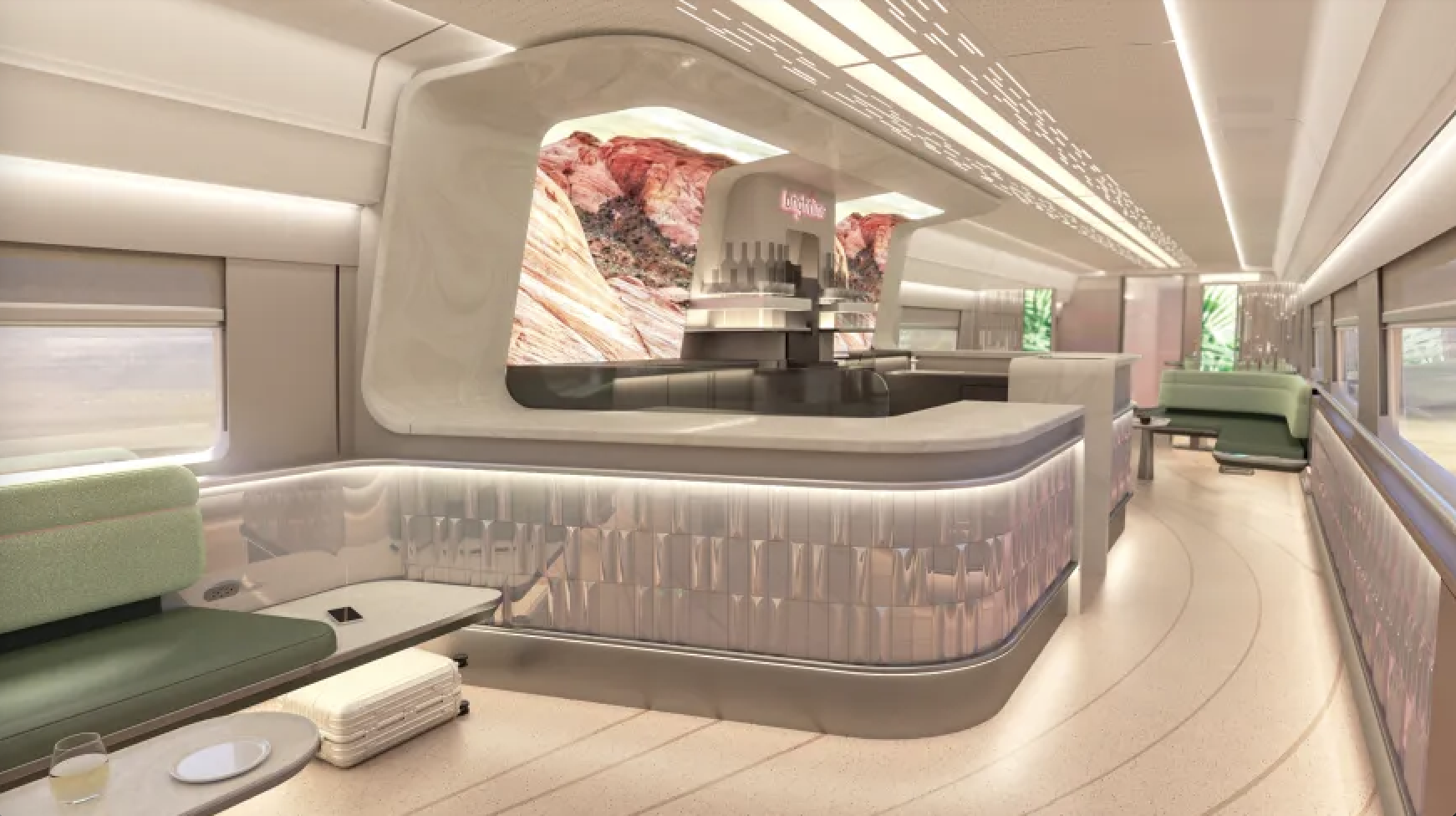 Among the images released by Brightline were renderings of the train’s “party car,” which, in true Las Vegas fashion, showed off plush seats and a modern bar, complete with illustrations of red and white wine.