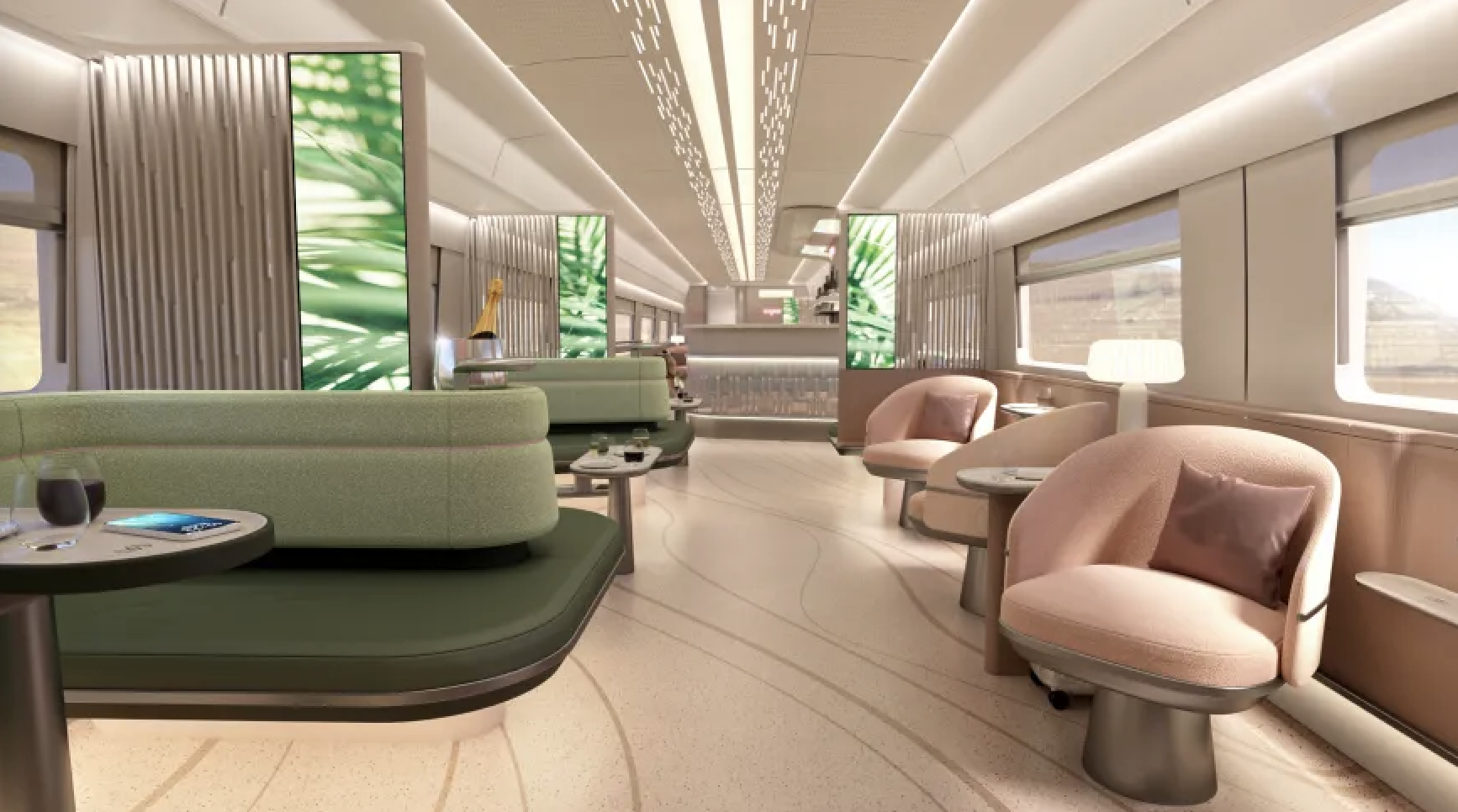 “With bold fuchsia interiors and a luxurious vibe, it’s the perfect space to kick back, pop some champagne, and enjoy the ride from Vegas to California in style,” Brightline said in its post.