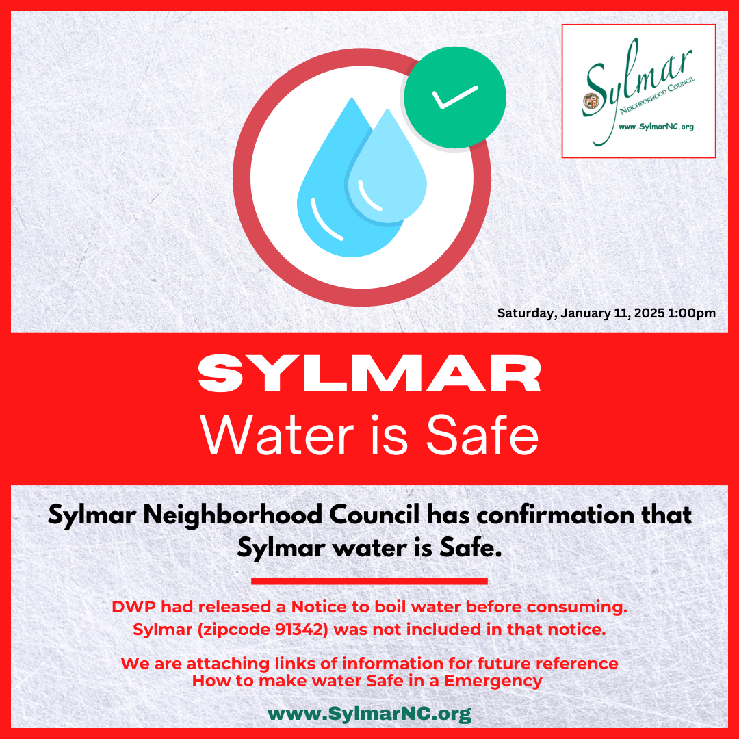 The Sylmar Neighborhood Council has confirmed with the LA County Supervisor's office and the DWP that there is NOT a Boil Water notice for Sylmar at this time and SYLMAR WATER IS SAFE.