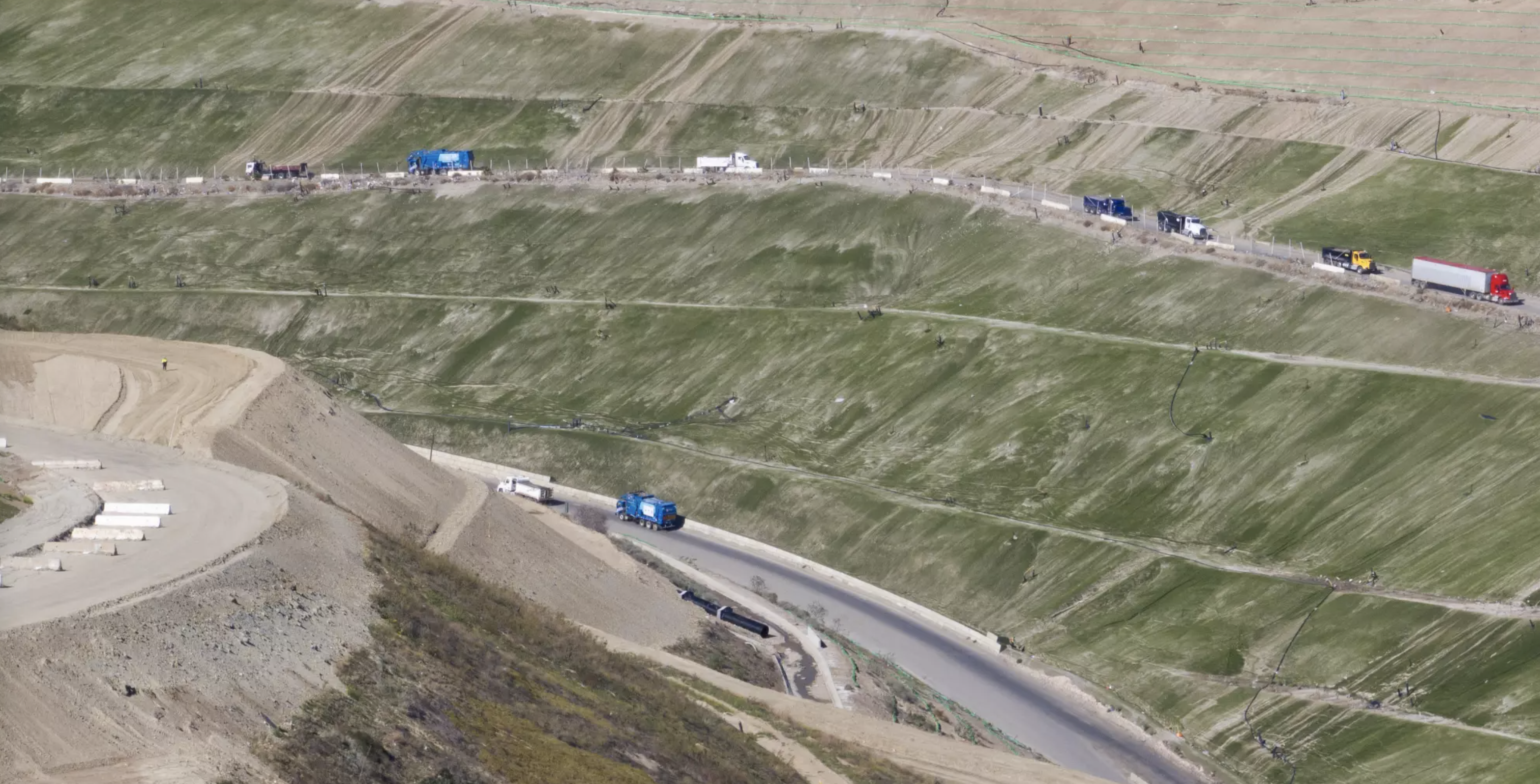 Trash trucks pass each other on the road to the Simi Valley Landfill in Ventura County, where the U.S. Army Corps of Engineers announced this week that toxic ash from schools destroyed by the Eaton fire would be dumped. (Mel Melcon / Los Angeles Times)