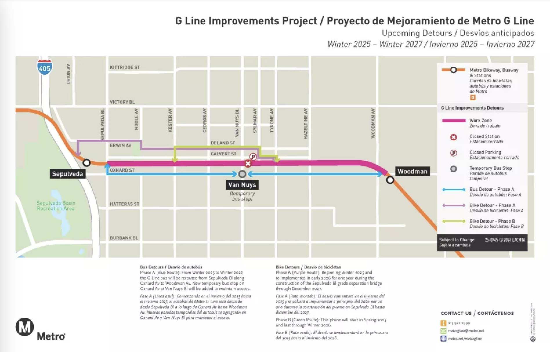 Starting this Friday (2/21/25), the Van Nuys Station on the Metro G Line will be closed for 3 years as part of the ongoing improvements to the Metro G Line. Crews will be working to build a new bridge over Van Nuys Blvd at Oxnard Street to enhance safety and service reliability.