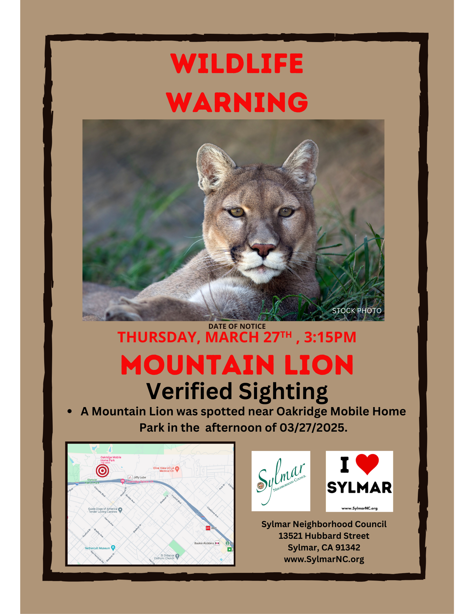 • Mountain Lion • SYLMAR - Wildlife Warning •