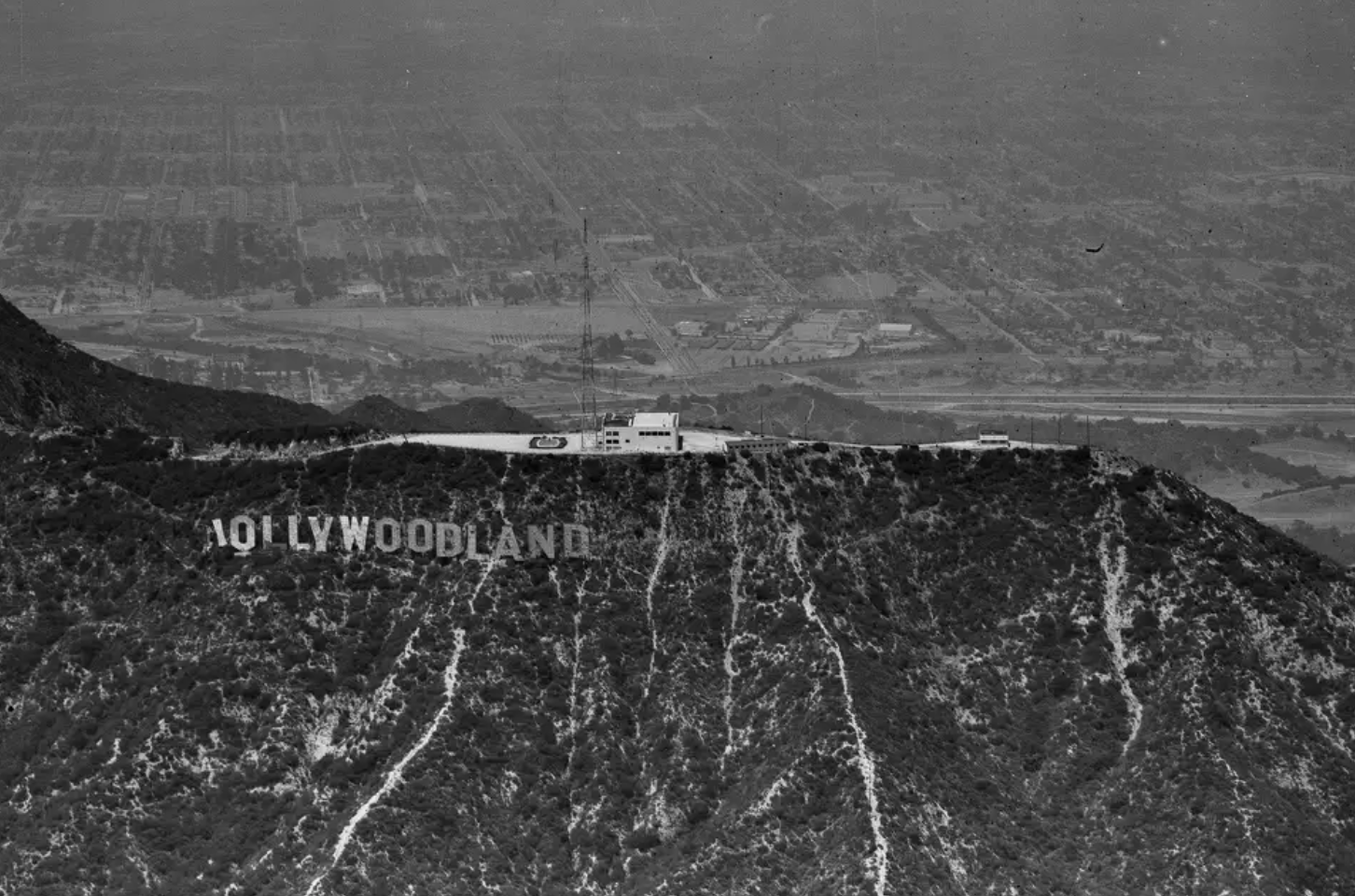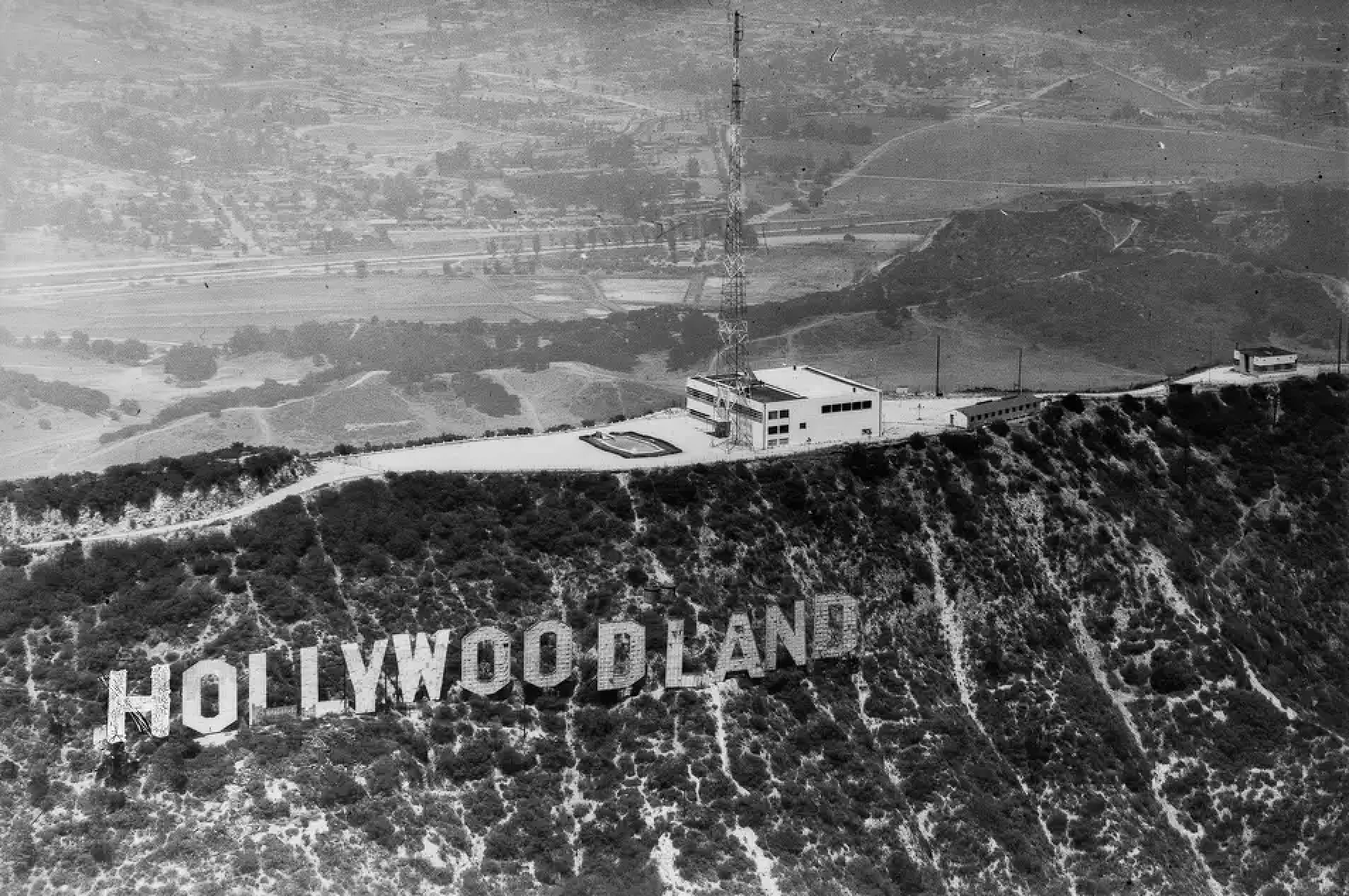 An aerial shot of the old Hollywoodland sign with Don Lee Company's studio atop the hill, including a pool. Bob Plunkett/The Huntington