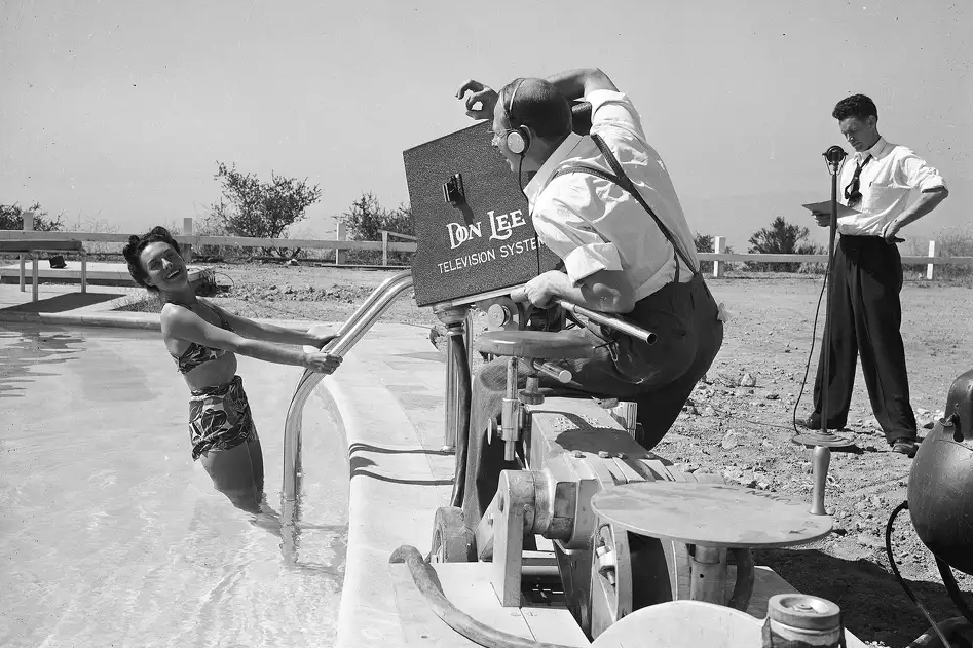 A cameraman lines up a shot for a Bathing Beauties segment at a pool overlooking Los Angeles. Dick Whittington Studio/The Huntington