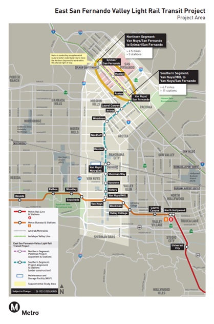 In 2020, the Metro Board approved construction of the East San Fernando Valley Light Rail Transit (ESFV LRT) Project that is now under construction on Van Nuys Bl in the City of Los Angeles. The Metro Board directed that further studies be conducted for a possible future connection to the Metrolink Antelope Valley Line (AVL), which currently operates along San Fernando Road adjacent to the planned new Pacoima Light Rail Station.