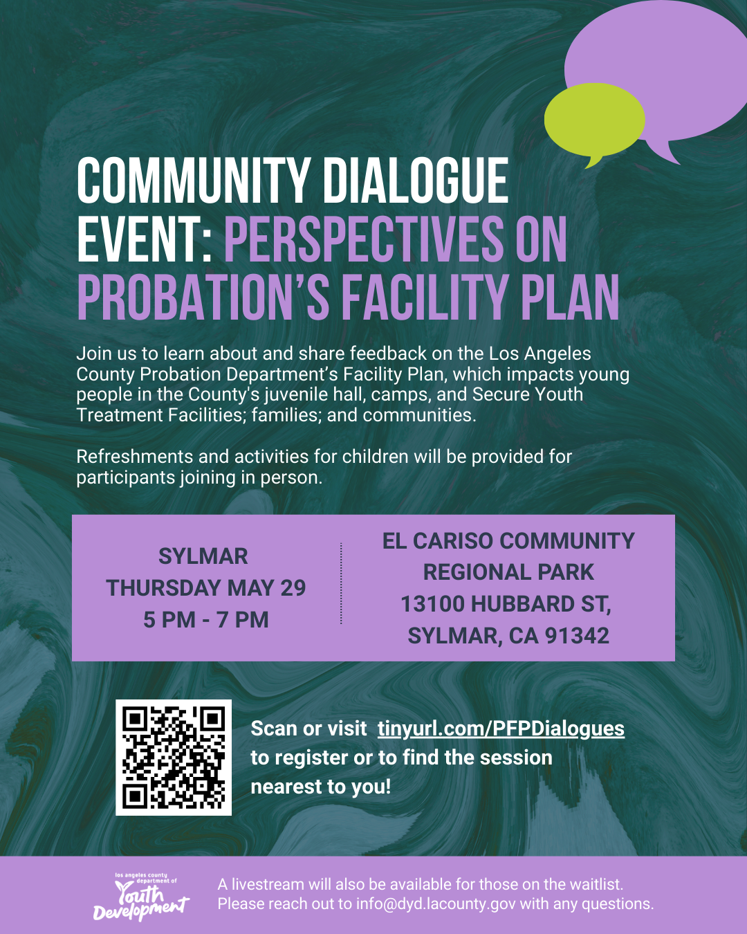 The Department of Youth Development will be holding Community Dialogue Events throughout May and June with community and County partners to discuss the Probation Department’s Facility Plan, which affects young people in the County’s juvenile hall, camp, and Secure Youth Treatment Facilities.