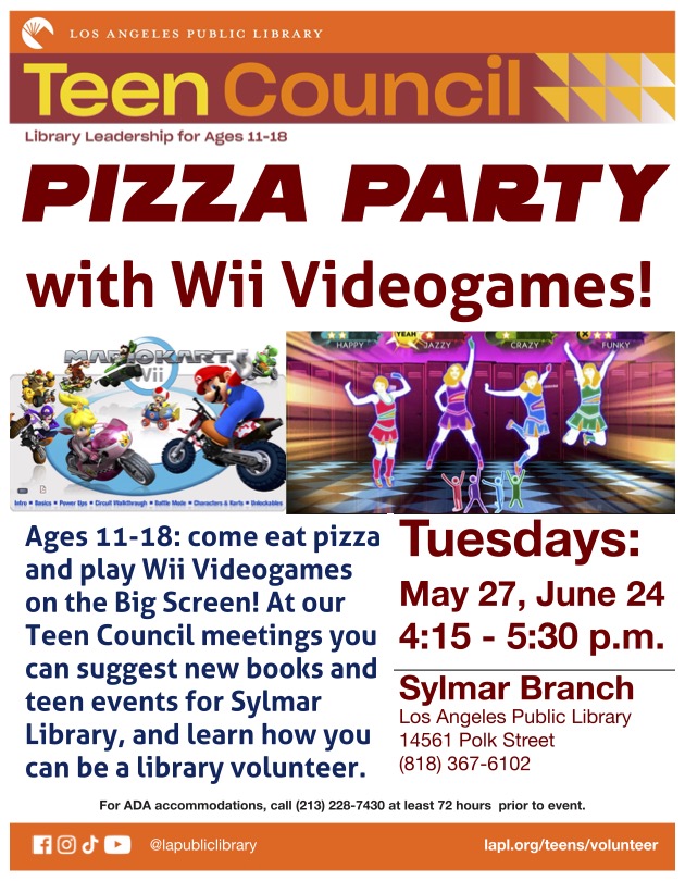 Ages 11-18: come eat pizza and play Wii Video games on the Big Screen! At our Teen Council meetings, you can suggest new books and teen events for Sylmar Library, and learn how you can be a library volunteer.