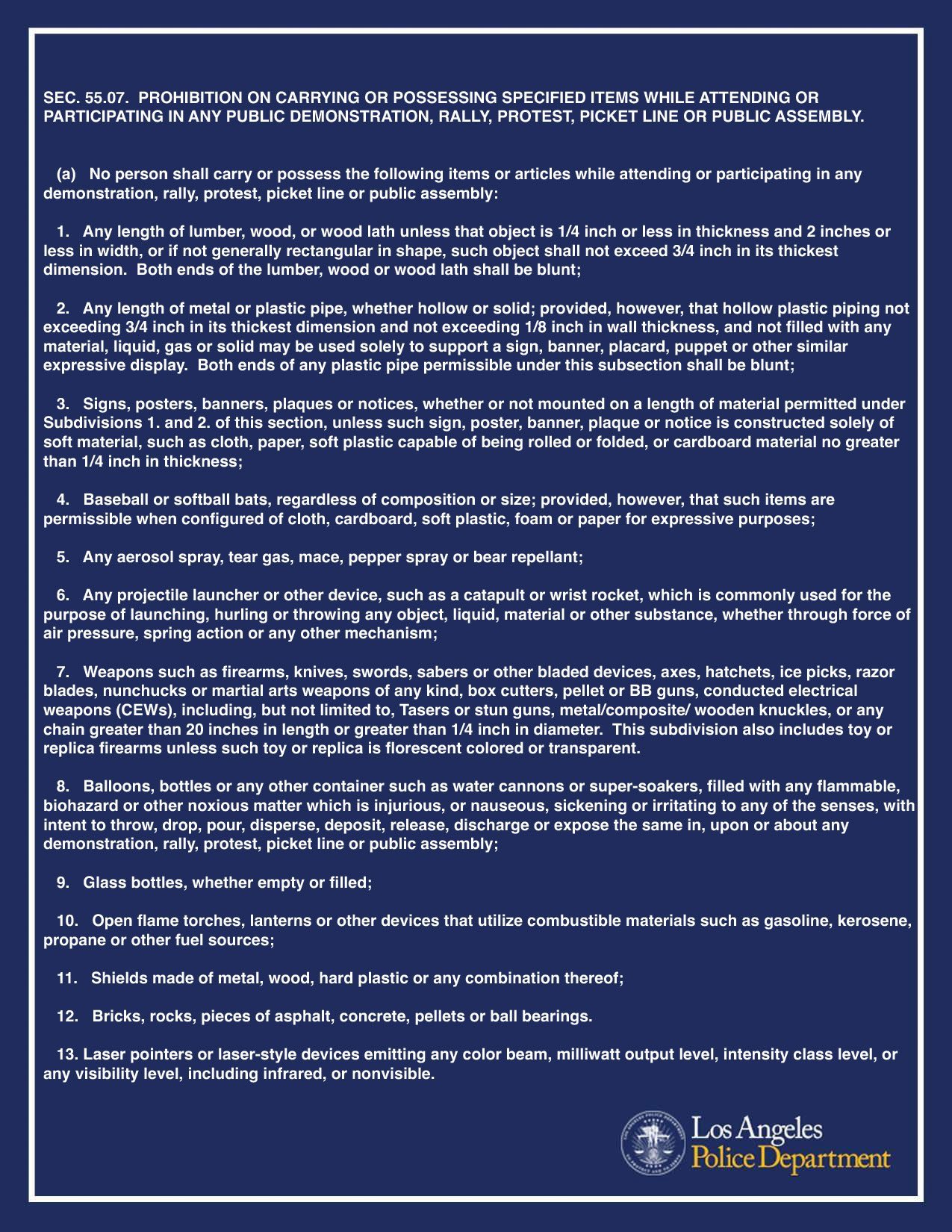 Please see the following image on SEC. 55.07. Prohibition on carrying or possessing specified items while attending or participating in any public demonstration, rally, protest, picket line, or public assembly.