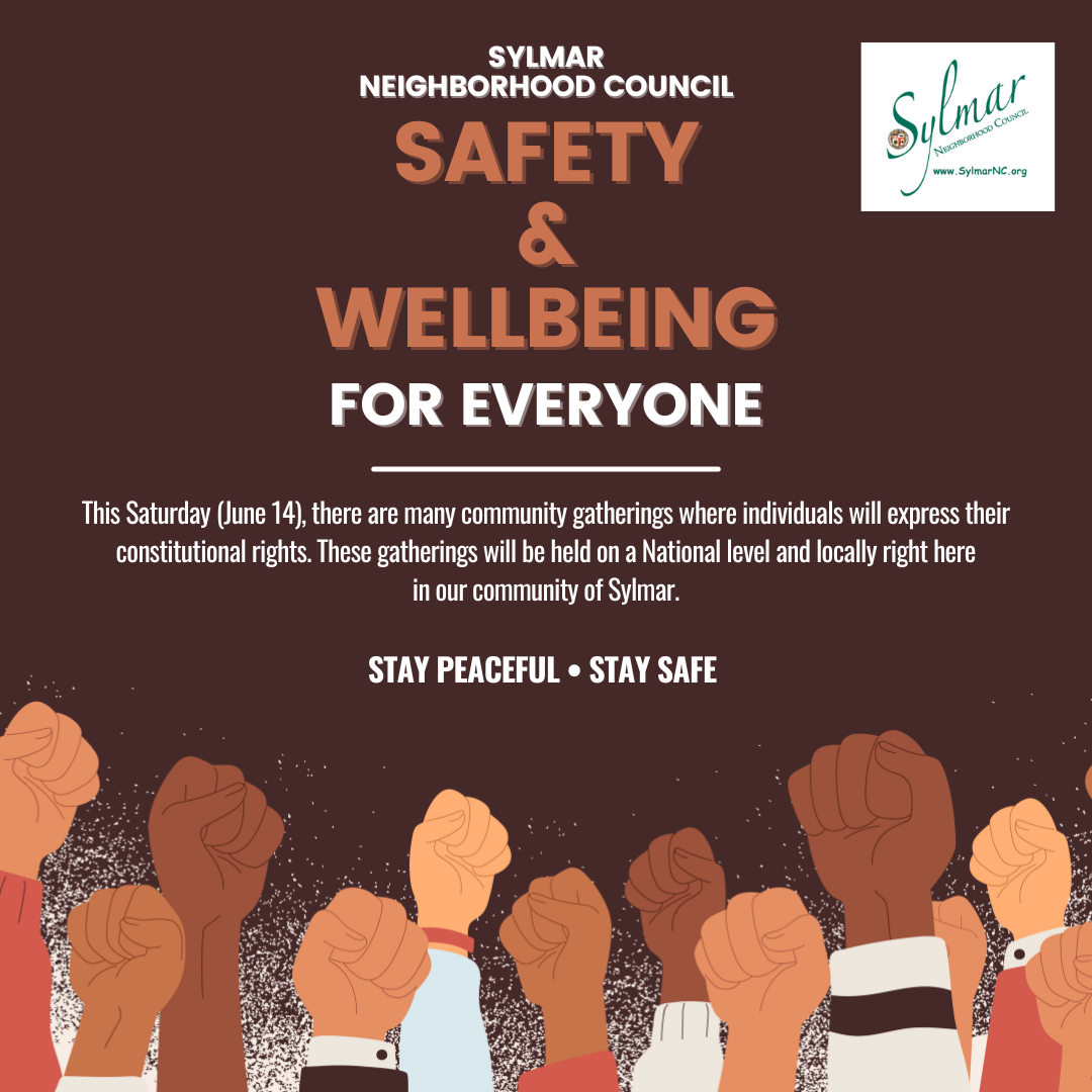 The Sylmar Neighborhood Council urges everyone to act with peace, respect, and to keep the safety of themselves and others in mind. It is expected to be warm weather stay hydrated.