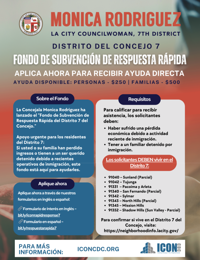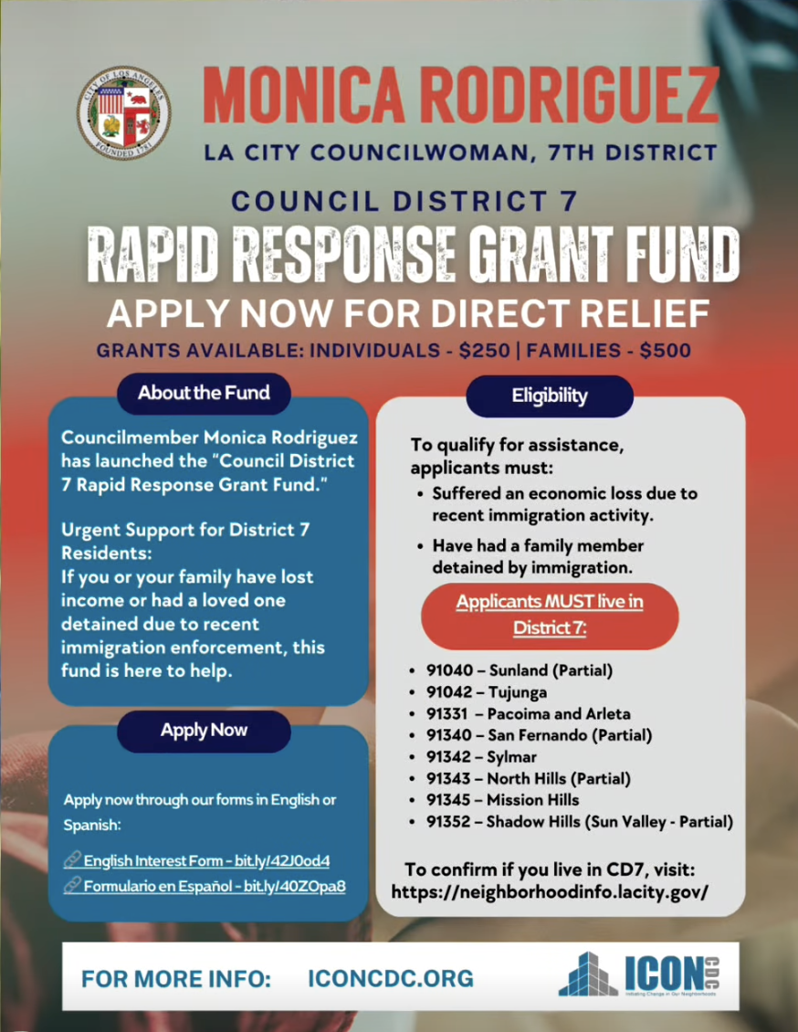Councilmember Monica Rodriguez has launched the "Council District 7 Rapid Response Grant Fund" to help residents of Council District 7 who have suffered a loss of income due to current immigration activity or have had a family member detained.