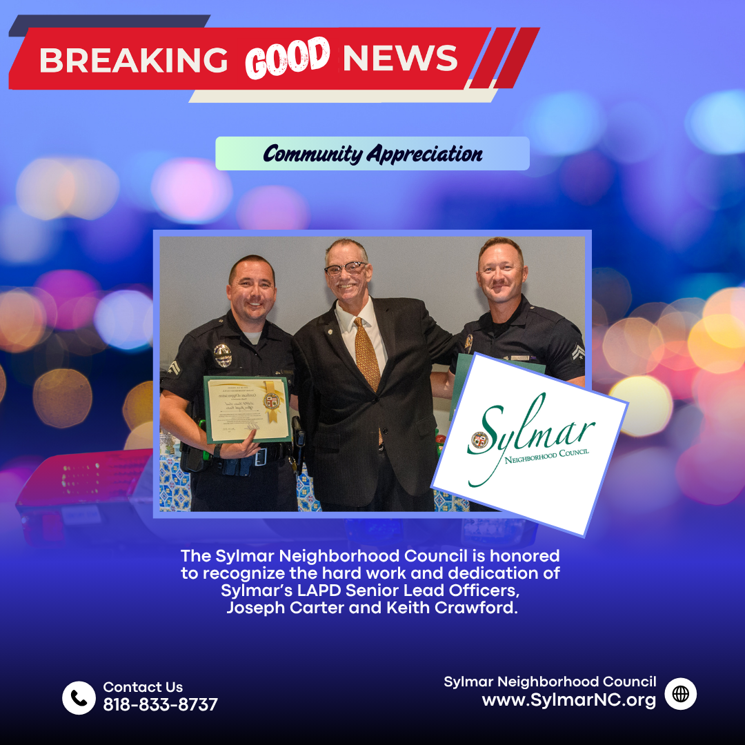 It is presented to Officers Joseph Carter and Keith Crawford. Sylmar's LAPD Senior Lead Officers for their dedication, hard work, and commitment to excellence. They have each made a significant impact in the community of Sylmar.