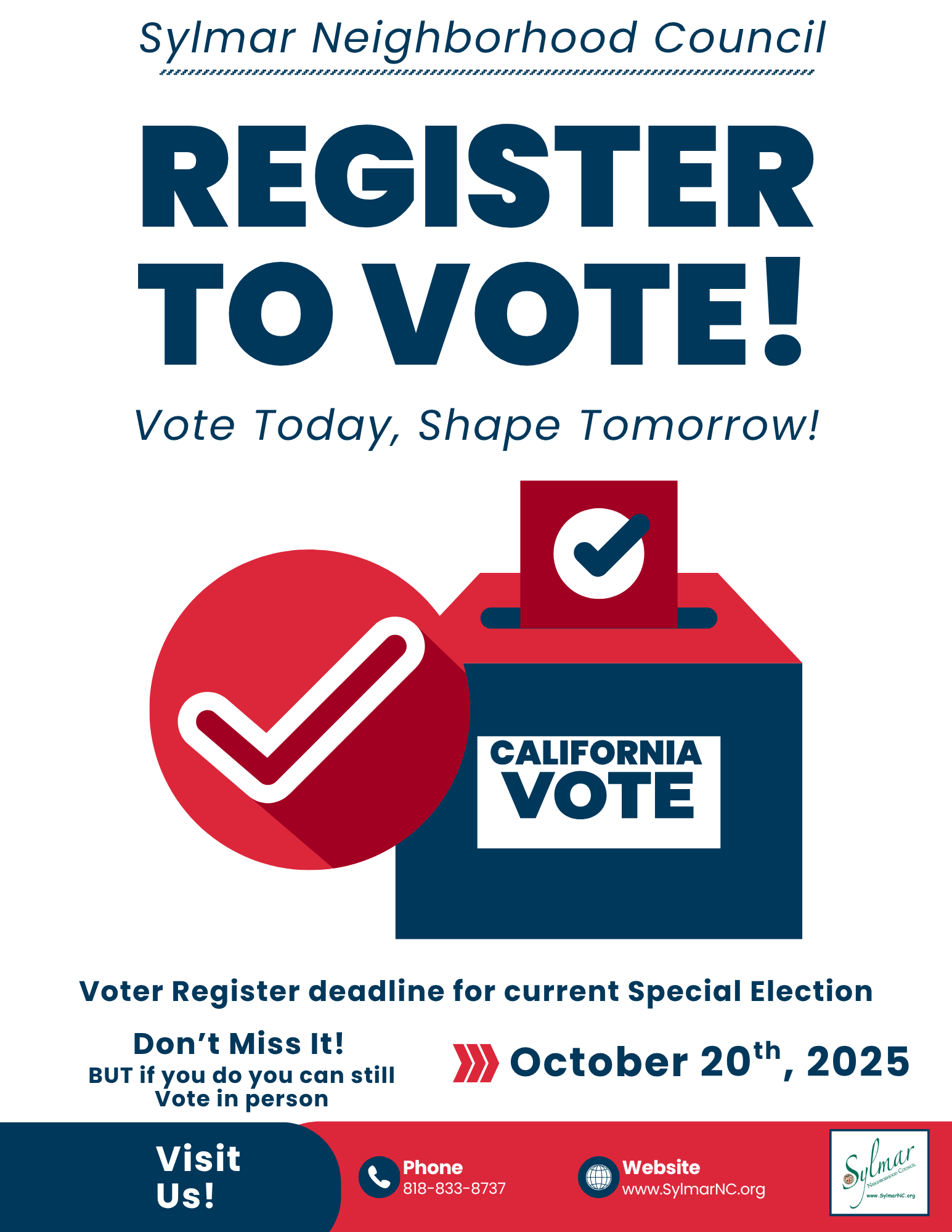 Sylmar Neighborhood Council urges everyone to register to Vote! We are here to help you get started!