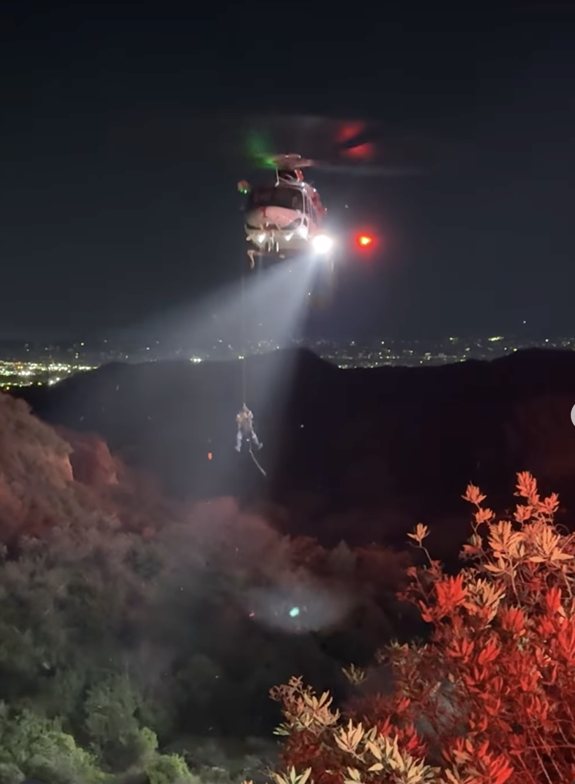 Firefighters hiked down the slope to reach and treat both patients, so an LAFD air ambulance could safely hoist a 35-year-old woman in serious condition and a 35-year-old man with stable vital signs. Both were airlifted directly to a local trauma center.