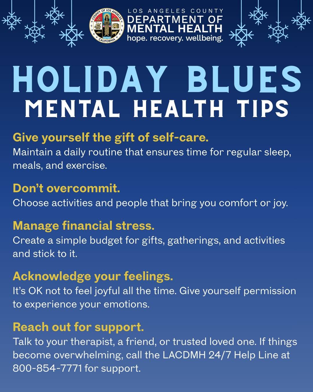 Here are a few simple mental health tips to help manage the holiday blues. If you're feeling overwhelmed or alone, support is available. Call our 24/7 Help Line at 800-854-7771 anytime to talk to someone who cares.