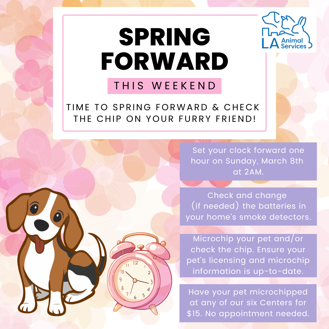 LOS ANGELES, March 5, 2026 - It's time to spring forward and set clocks ahead one hour this Sunday, March 8 at 2am so LA Animal Services wants to remind pet owners to check your pet's microchip and licensing information. Even if your pet is microchipped, outdated contact information can delay or prevent a successful reunion.