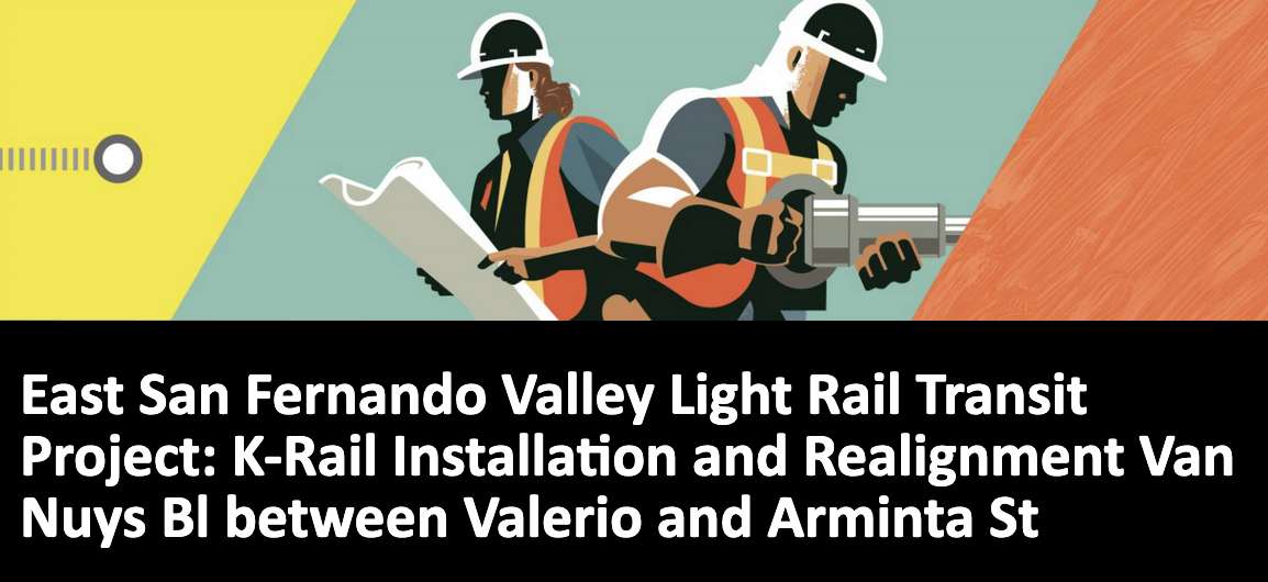 Metro's contractor began utility work along Van Nuys Bl between Gault St and Arminta St in April 2025. The advanced utility work is anticipated through mid-2027. The second phase of K-rail installation (concrete barriers on Van Nuys Bl) is scheduled to start on Friday, October 10 from 8pm through Monday, October 13, 2025, at 6am.