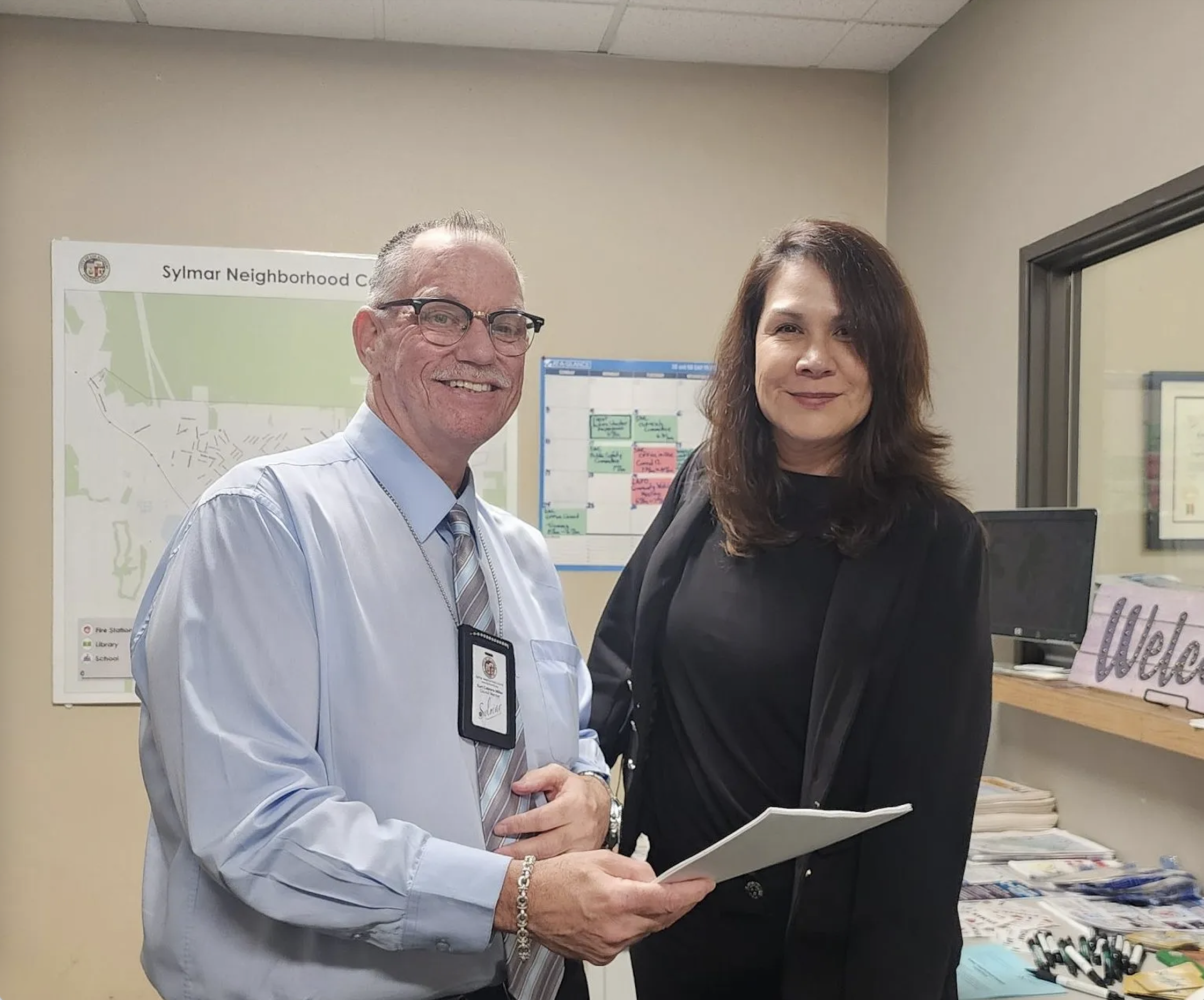 LAPD Sgt. Adrienne Legaspi (right), pictured with Kurt Cabrera-Miller, president of the Sylmar Neighborhood Council, led an Active Shooter Prevention presentation at the Sylmar Neighborhood Council office on March 4. (SFVS/el Sol Photo/Maria Luisa Torres)